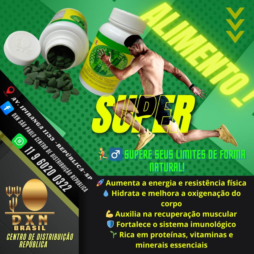 🌿 Benefícios da Espirulina DXN💪 Rica em proteínas, vitaminas e minerais.🛡️ Fortalece o sistema imunológico.🫀 Ajuda no controle do colesterol e circulação.🌱 Desintoxica e dá mais energia.⚔️ Poder antioxidante contra o envelhecimento.🍽️ Aumenta saciedade e apoia no controle de peso.✨ 100% natural — energia e saúde em cada dose! CONTATO